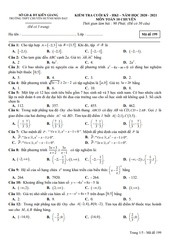 Đề thi học kì 1 (HK1) lớp 10 môn Toán chuyên năm 2020 2021 trường chuyên Huỳnh Mẫn Đạt Kiên Giang