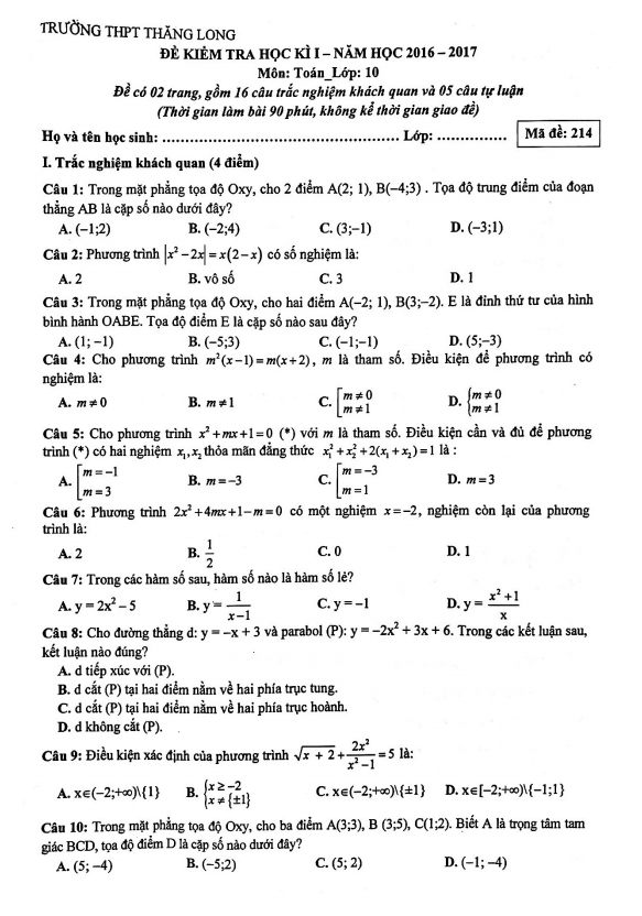 Đề thi học kỳ 1 Toán lớp 10 năm 2016 – 2017 trường THPT Thăng Long – Hà Nội