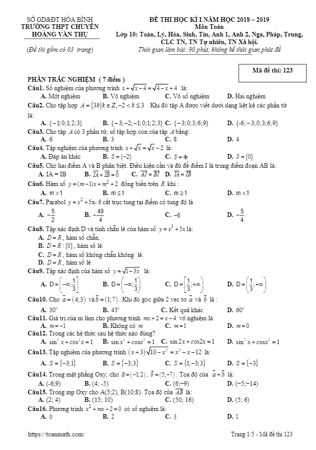 Đề thi học kỳ 1 môn Toán lớp 10 năm 2018 – 2019 trường chuyên Hoàng Văn Thụ – Hòa Bình có mã đề 123, gồm 05 trang với tổng cộng 35 câu hỏi trắc nghiệm và 03 câu hỏi tự luận. Thời gian làm bài là 90 phút. Mục tiêu của đề thi này là kiểm tra kiến thức và kỹ năng Toán của học sinh lớp 10 cuối học kỳ 1, bao gồm các lớp 10 Toán, 10 Lý, 10 Hóa, 10 Sinh, 10 Tin, 10 Anh 1, 10 Anh 2, 10 Nga, 10 Pháp, 10 Trung, 10 CLC TN, 10 TN Tự nhiên, 10 TN Xã hội.