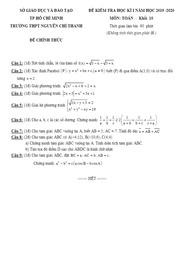 Đề thi học kì 1 Toán lớp 10 năm 2019 – 2020 trường Nguyễn Chí Thanh TP HCM