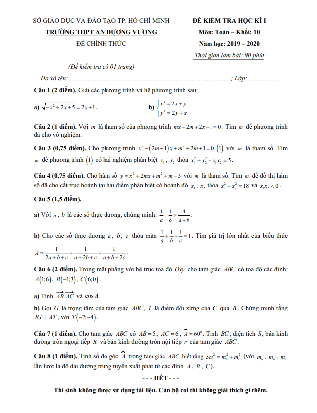 Đề thi học kì 1 (HK1) môn Toán lớp 10 năm học 2019 – 2020 trường THPT An Dương Vương TP HCM