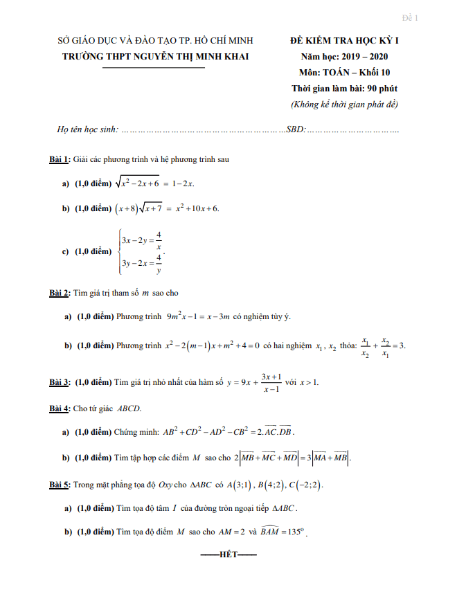 Trích dẫn và phân tích nội dung đề thi Toán lớp 10 năm 2019 – 2020 của Trường THPT Nguyễn Thị Minh Khai – TP HCM: