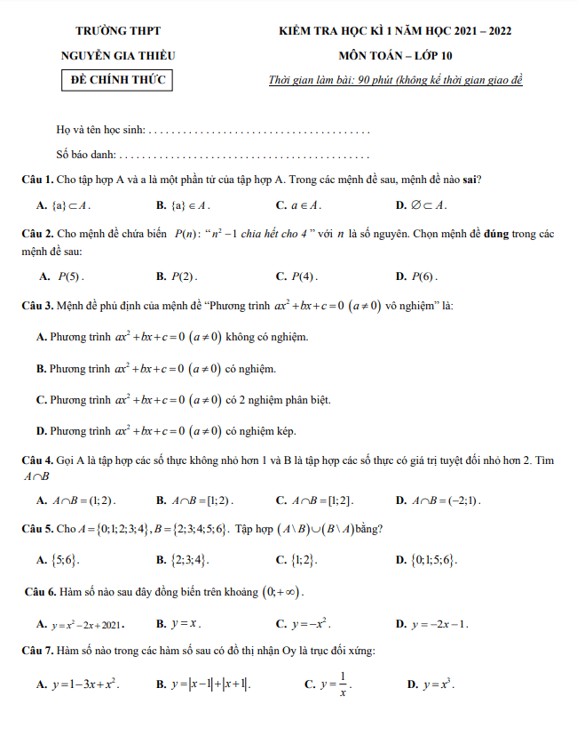 Đề thi học kỳ 1 môn Toán lớp 10 năm học 2021-2022 trường THPT Nguyễn Gia Thiều – Hà Nội đã được Sytu giới thiệu đến quý thầy cô và các em học sinh lớp 10. Đề thi bao gồm 50 câu trắc nghiệm trải dài trên 08 trang, các em sẽ có 90 phút để làm bài (không tính thời gian phát đề).Một số câu hỏi đặt ra trong đề thi:1. Trong số các quy tắc sau, quy tắc nào không phải là một hàm số? A. Quy tắc đặt tương ứng mỗi số thực dương với căn bậc hai của nó. B. Quy tắc đặt tương ứng mỗi số thực với căn bậc ba của nó. C. Quy tắc đặt tương ứng mỗi số thực với bình phương của nó. D. Quy tắc đặt tương ứng mỗi số thực dương với giá trị tuyệt đối của nó.2. Khi một quả bóng được đá lên, quả bóng sẽ đạt đến độ cao nào sau một thời gian xác định? Yêu cầu tính toán độ cao lớn nhất mà quả bóng đạt được kể từ lúc bắt đầu.3. Xét lời giải của một bài toán, sau khi giải phương trình ta thấy x = 2 không thỏa mãn. Cần xác định liệu lời giải đó có đúng hay sai, và phân tích sai lầm ở đâu.4. Cho tam giác ABC đều cạnh a và k là một số thực âm thay đổi. Cần xác định tập hợp các điểm M thỏa mãn điều kiện cho trước.5. Trong mặt phẳng tọa độ Oxy, cần tính độ dài đoạn thẳng CO khi biết cụm điểm A, B và C.Những câu hỏi đặt ra trong đề thi không chỉ giúp học sinh thử nghiệm kiến thức, mà còn khuyến khích phát triển tư duy logic và khả năng giải quyết vấn đề. Để đạt kết quả tốt trong bài thi, học sinh cần rèn luyện trước và đặc biệt cẩn thận trong việc hiểu và áp dụng kiến thức đã học vào thực hành.