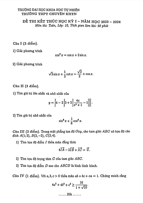 Đề thi học kỳ 1 môn Toán lớp 10 năm 2023-2024 trường THPT chuyên KHTN Hà Nội
