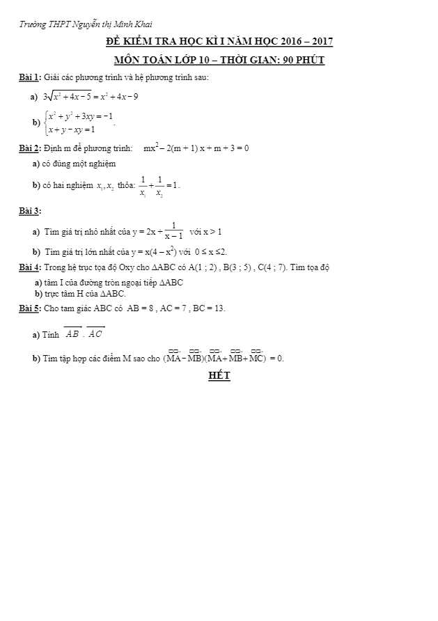 Đề thi học kì 1 (HK1) lớp 10 môn Toán năm học 2016 2017 trường Nguyễn Thị Minh Khai TP.HCM