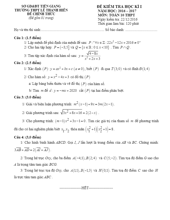 Đề thi học kì 1 (HK1) lớp 10 môn Toán năm học 2016 2017 trường THPT Lê Thanh Hiền Tiền Giang