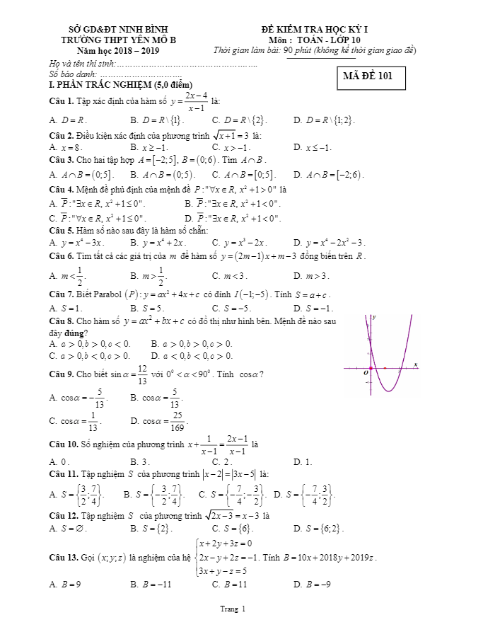 Đề thi học kì 1 Toán lớp 10 trường Yên Mô B Ninh Bình năm học 2018 – 2019