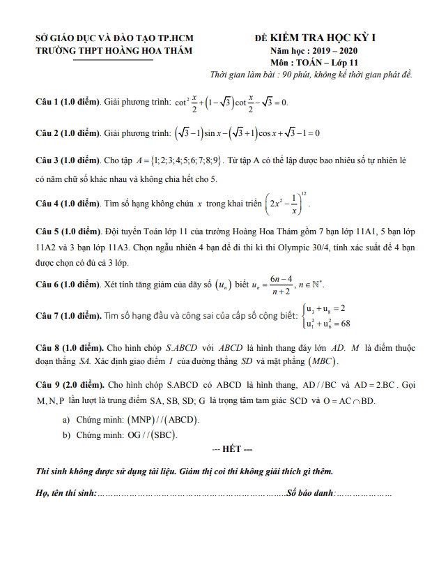 Đề thi học kì 1 Toán lớp 11 năm 2019 – 2020 trường Hoàng Hoa Thám TP HCM