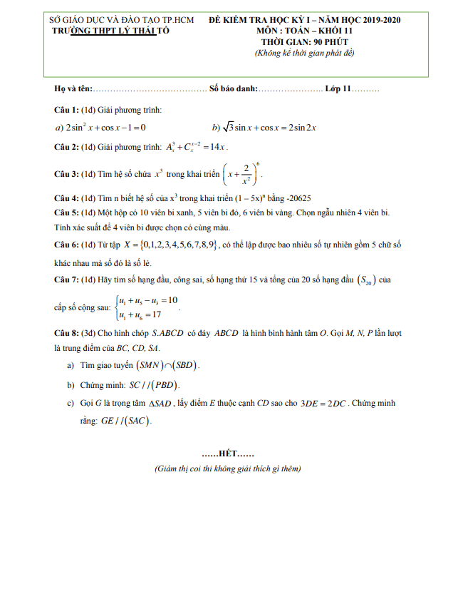 Đề thi học kì 1 Toán lớp 11 năm 2019-2020 trường Lý Thái Tổ TP HCM