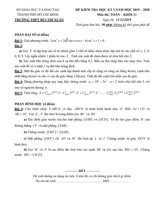 Đề thi học kỳ 1 Toán lớp 11 năm 2019 -2020 trường THPT Bùi Thị Xuân TP HCM