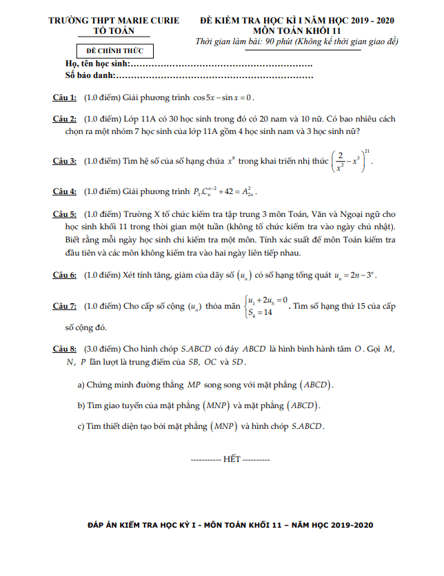 Đề thi học kỳ 1 (HK1) lớp 11 môn Toán năm 2019 2020 trường THPT Marie Curie TP HCM