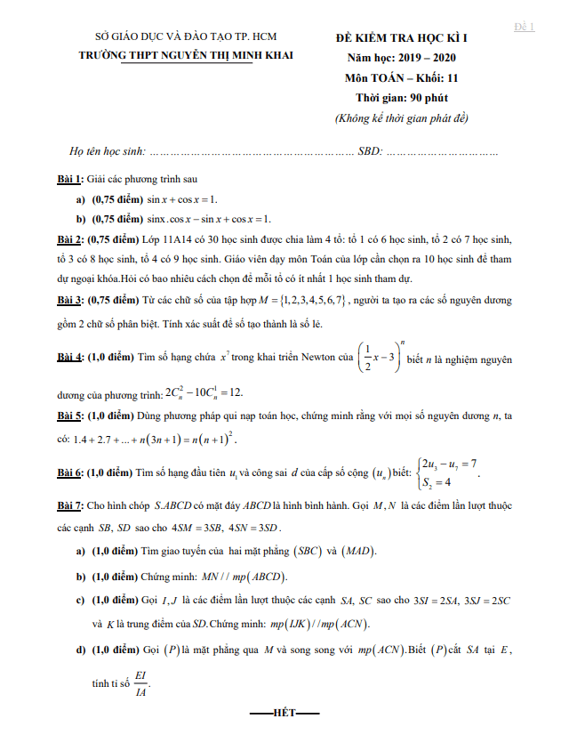 Đề thi học kì 1 môn Toán lớp 11 năm 2019-2020 trường THPT Nguyễn Thị Minh Khai TP HCM