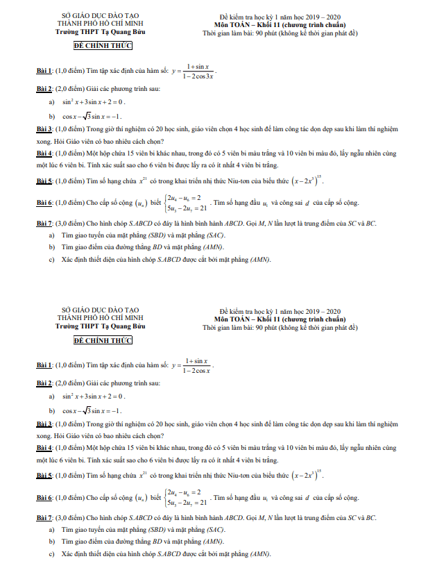 Trích dẫn đề thi HK1 Toán lớp 11 năm 2019 – 2020 trường THPT Tạ Quang Bửu – TP HCM: