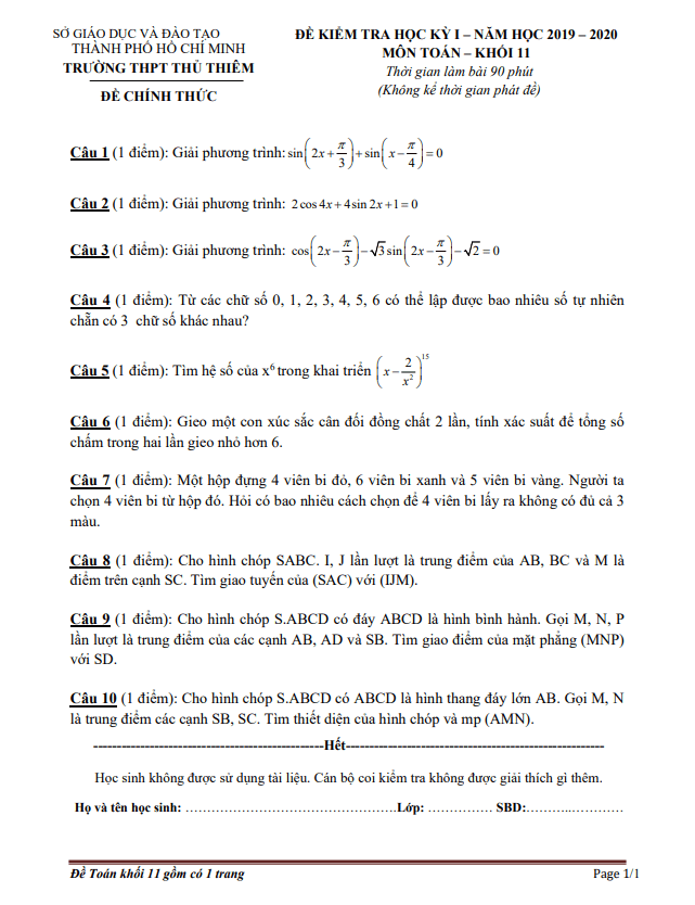 Đề thi học kì 1 môn Toán lớp 11 năm 2019-2020 của trường THPT Thủ Thiêm TP HCM là tài liệu ôn tập cần thiết để các em học sinh chuẩn bị cho kỳ thi sắp tới. Đề thi này sẽ giúp các em ôn tập và nắm vững kiến thức, kỹ năng cần thiết để đạt kết quả cao trong kỳ thi học kì 1.