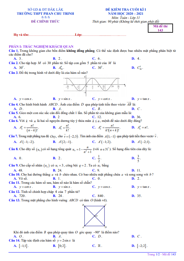 Đề thi học kì 1 (HK1) môn Toán lớp 11 năm 2020 – 2021 của trường THPT Phan Chu Trinh Đắk Lắk đã được biên soạn một cách cẩn thận và chi tiết. Đề thi bao gồm cả phần trắc nghiệm và tự luận, với 25 câu trắc nghiệm chiếm 5 điểm và 4 câu tự luận chiếm 5 điểm. Thời gian làm bài là 90 phút.Trong đề thi, có các bài toán đa dạng và phong phú, như bài toán về xác suất, hình học, đại số… Ví dụ, một câu hỏi hấp dẫn trong đề thi là về xác suất chọn random một điểm trong hình vuông đã cho mà điểm đó thuộc vào hình tròn nội tiếp hình vuông. Bên cạnh đó, còn có câu hỏi về hình chóp, về không gian và mặt phẳng.Đề thi còn đi kèm đáp án và lời giải chi tiết cho mã đề 143, 295, 387, 415, giúp các em học sinh tự kiểm tra và ôn tập sau khi làm xong đề. Nội dung đề thi được trình bày một cách rõ ràng, dễ hiểu, giúp học sinh củng cố kiến thức và chuẩn bị tốt cho kì thi học kì 1.Với đề thi này, học sinh sẽ có cơ hội rèn luyện và nâng cao kỹ năng giải bài toán, đồng thời phát triển tư duy logic và sự sáng tạo. Đây thực sự là một tài liệu hữu ích giúp học sinh chuẩn bị tốt cho kì thi học kì đầu năm học.