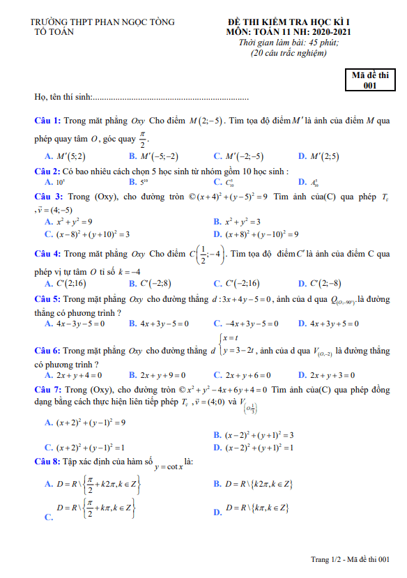 Đề thi học kỳ 1 (HK1) lớp 11 môn Toán năm 2020-2021