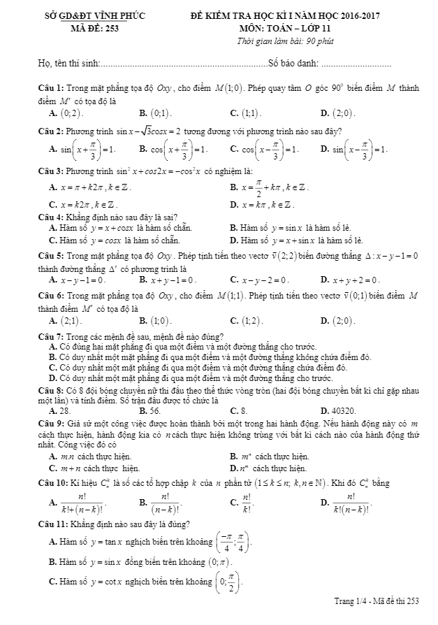 Đề thi học kì 1 môn Toán lớp 11 năm học 2016 – 2017 sở GD và ĐT Vĩnh Phúc đã được thiết kế với 8 mã đề khác nhau, mỗi mã đề bao gồm 45 câu hỏi trắc nghiệm. Những câu hỏi trong đề thi đa dạng và đòi hỏi sự hiểu biết sâu rộng về kiến thức Toán của học sinh.