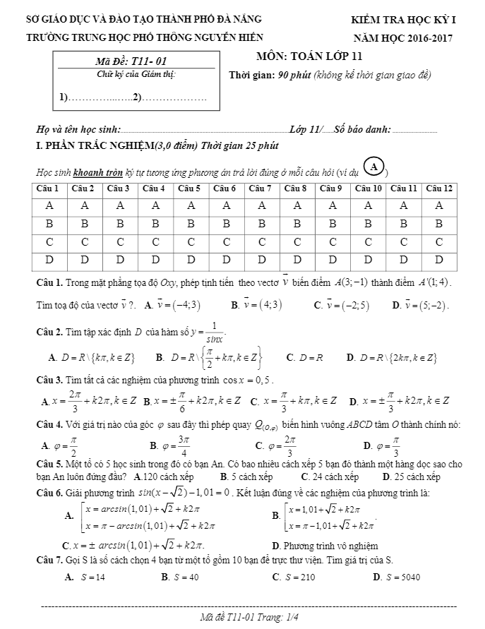 Đề thi học kì 1 (HK1) lớp 11 môn Toán năm học 2016 2017 trường THPT Nguyễn Hiền Đà Nẵng