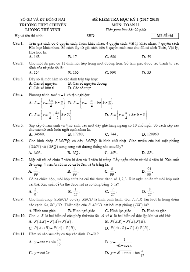 Đề thi học kỳ 1 (HK1) lớp 11 môn Toán năm học 2017 2018 trường THPT chuyên Lương Thế Vinh Đồng Nai