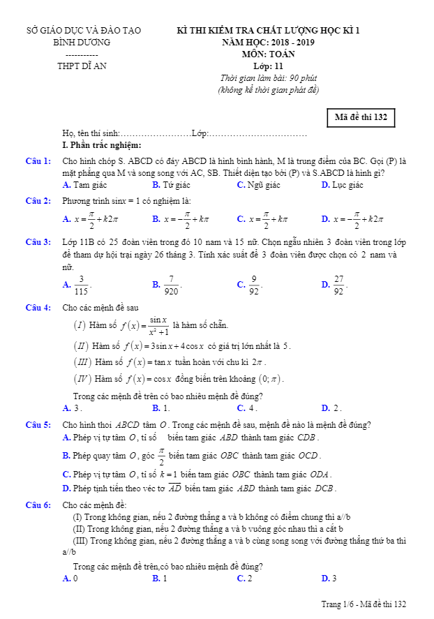 Đề thi học kỳ 1 Toán lớp 11 năm học 2018 – 2019 trường THPT Dĩ An Bình Dương