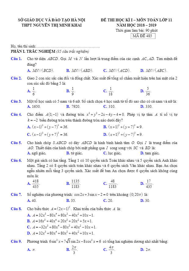 Đề thi học kỳ 1 môn Toán lớp 11 năm học 2018-2019 của trường THPT Nguyễn Thị Minh Khai Hà Nội (mã đề 485) là một bộ đề được biên soạn nhằm tổng kết lại các kiến thức mà học sinh đã học trong giai đoạn học kỳ 1 vừa qua. Đề thi có cấu trúc gồm 35 câu hỏi trắc nghiệm khách quan và 4 câu hỏi tự luận, tổng thời gian làm bài là 90 phút.Trong đề thi, có nhiều câu hỏi khó khăn và đa dạng về nội dung, từ việc tìm mệnh đề đúng, xác suất chọn sách đến các câu hỏi trắc nghiệm phức tạp. Ví dụ như câu hỏi tìm mệnh đề đúng trong số các mệnh đề đã cho, câu hỏi về xác suất chọn sách không cùng môn hoặc câu hỏi về xác suất trả lời đúng 35 câu.Đề thi HK1 Toán lớp 11 môn Toán năm học 2018-2019 của trường THPT Nguyễn Thị Minh Khai Hà Nội là một bài kiểm tra đầy thách thức, giúp học sinh tổng kết, làm rõ kiến thức và kỹ năng đã học từ khi bắt đầu năm học đến nay. Đây là cơ hội để học sinh thể hiện khả năng tự giải quyết vấn đề, phân tích và suy luận logic. Chắc chắn rằng, việc làm bài đề thi này sẽ giúp học sinh nắm vững kiến thức và chuẩn bị tốt cho kì thi cuối kỳ sắp tới.