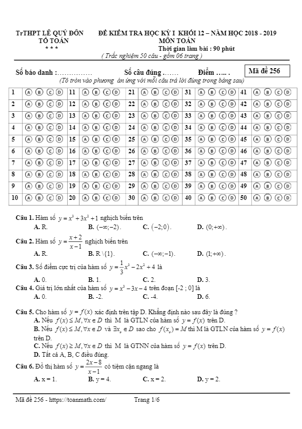 Đề thi học kỳ 1 môn Toán lớp 12 trường THPT Lê Quý Đôn Quảng Ngãi năm 2018 – 2019 có mã đề 256 được biên soạn với 50 câu hỏi trắc nghiệm trải dài trên 6 trang giấy. Thời gian làm bài thi là 90 phút, giúp giáo viên đánh giá toàn diện kiến thức đã học của học sinh trong học kỳ 1 của năm học đó.Đề thi bao gồm nhiều dạng bài, từ cơ bản đến nâng cao nhằm kiểm tra khả năng giải quyết vấn đề, kỹ năng tính toán, phân tích và suy luận logic của học sinh. Một số câu hỏi như viết hàm số có đạo hàm trên một khoảng cho trước, tính tích của hai số a và b theo điều kiện cho trước, hoặc tính tỉ số thể tích của hai khối trụ được tạo ra từ việc gò tấm tôn hình chữ nhật theo các cạnh khác nhau.Đề thi cũng tập trung vào việc kiểm tra khả năng ứng dụng kiến thức Toán vào thực tế, khuyến khích học sinh tư duy sáng tạo và phát triển kỹ năng giải quyết vấn đề. Việc biên soạn đề thi theo hình thức trắc nghiệm giúp học sinh làm bài nhanh chóng và chính xác hơn, đồng thời cung cấp đáp án chi tiết để học sinh tự kiểm tra và sửa sai.Đề thi HK1 Toán lớp 12 năm 2018 – 2019 trường THPT Lê Quý Đôn Quảng Ngãi là cơ hội để học sinh thể hiện kiến thức và khả năng của mình trong môn học quan trọng này. Qua đó, học sinh có thể tự đánh giá được mình đang đứng ở đâu và cần cải thiện những điểm yếu để đạt kết quả tốt nhất.
