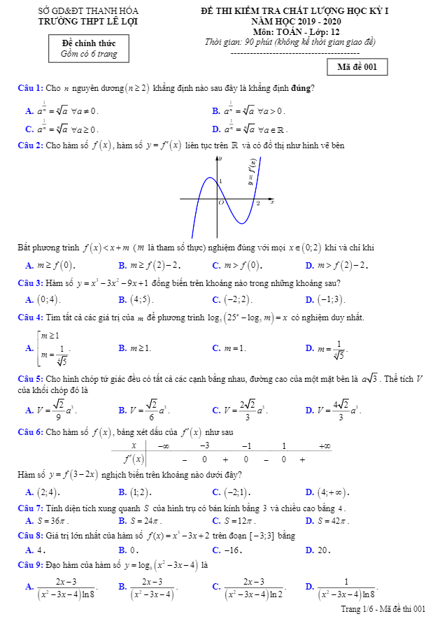 Đề thi học kỳ 1 năm học 2019 – 2020 môn Toán của trường THPT Lê Lợi, Thanh Hóa đã diễn ra vào ngày … tháng 12 năm 2019. Đề thi này được biên soạn với mã đề 001 và bao gồm 50 câu hỏi và bài toán trắc nghiệm khách quan, được thiết kế để kiểm tra kiến thức của học sinh về các chủ đề như hàm số và đồ thị, mũ và logarit, khối đa diện và thể tích của chúng, nón – trụ – cầu.Để giúp cho học sinh có thể chuẩn bị tốt cho kỳ thi, đề thi học kỳ 1 Toán lớp 12 năm 2019 – 2020 của trường THPT Lê Lợi được cung cấp cùng với đáp án các mã đề 001, 002, 003, 004, 005, 006, 007, 008 và lời giải chi tiết một số câu vận dụng cao.Nội dung của đề thi bao gồm các bài toán và câu hỏi thú vị và đa dạng như:- Tính tỉ lệ tuyển dụng mới hàng năm theo nghị quyết về giảm biên chế cán bộ công chức.- Tính chiều cao của hình trụ dựa trên thông tin về hình trụ và tứ giác MNN’M’M’.- Tính thời gian trả hết số tiền vay theo phương thức trả góp với lãi suất nhất định.- Xác định tỉ số bán kính của miệng cốc và đáy cốc dựa trên dạng hình của nó.- Phân tích đồ thị hàm số f(x) để đưa ra các nhận xét về giá trị, điểm cực trị và cách đồ thị cắt trục hoành.Đề thi học kỳ 1 Toán lớp 12 của trường THPT Lê Lợi, Thanh Hóa không chỉ là cơ hội để học sinh tự kiểm tra kiến thức mà còn giúp họ ôn tập, củng cố những kiến thức cần thiết để đạt kết quả cao trong kỳ thi.