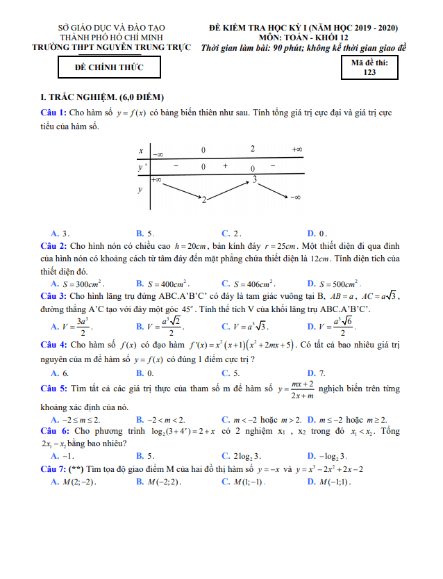 Đề thi học kì 1 (HK1) lớp 12 môn Toán năm 2019 2020 trường THPT Nguyễn Trung Trực TP HCM