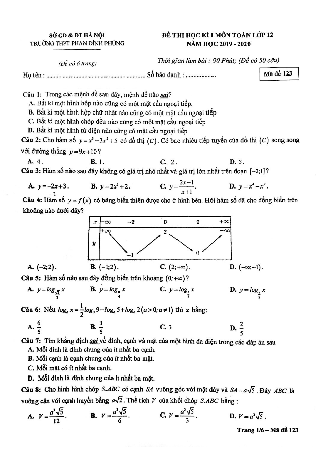 Xin chào quý thầy cô và các em học sinh! Hôm nay, Sytu xin giới thiệu đến quý vị đề thi học kì 1 môn Toán lớp 12 năm học 2019 – 2020 của trường THPT Phan Đình Phùng tại Hà Nội. Đề thi có mã đề là 123, bao gồm 7 trang với 50 câu trắc nghiệm, thời gian làm bài là 90 phút.