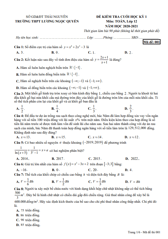Đề thi học kì 1 (HK1) lớp 12 môn Toán năm 2020-2021 tại trường Lương Ngọc Quyến Thái Nguyên là một bộ đề thi gồm 50 câu hỏi và bài toán dạng trắc nghiệm trải dài trên 06 trang đề thi. Thời gian làm bài là 90 phút và đề thi có đáp án mã đề 001.Trong đề thi, có một bài toán liên quan đến việc sơn các cây cột hình trụ tròn tại mặt tiền của nhà văn hóa. Bài toán yêu cầu tính toán chi phí mà chủ đầu tư phải chi ra để sơn hết các cây cột, từ đó đưa ra kế hoạch tài chính cho dự án.Bên cạnh đó, cũng có bài toán khác về việc xác định thể tích lớn nhất của ao nuôi cá hình trụ được đào trên mảnh đất hình vuông. Bài toán này đòi hỏi sự cẩn trọng trong việc xác định kích thước và vị trí đặt ao để đạt được thể tích lớn nhất.Ngoài ra, đề thi còn đưa ra một bài toán về vay vốn ngân hàng đầu tư vào dự án trồng rau sạch và tính toán số tiền cần trả sau hai năm kết thúc hợp đồng. Bài toán này giúp học sinh hiểu rõ về cách tính lãi suất và số tiền cần trả trong các giao dịch vay vốn.Tổng thể, đề thi HK1 Toán lớp 12 năm 2020-2021 tại trường Lương Ngọc Quyến Thái Nguyên là một bài kiểm tra có nhiều bài toán thú vị và mang tính ứng dụng cao, giúp học sinh rèn luyện kỹ năng giải quyết vấn đề và áp dụng kiến thức Toán vào thực tế.