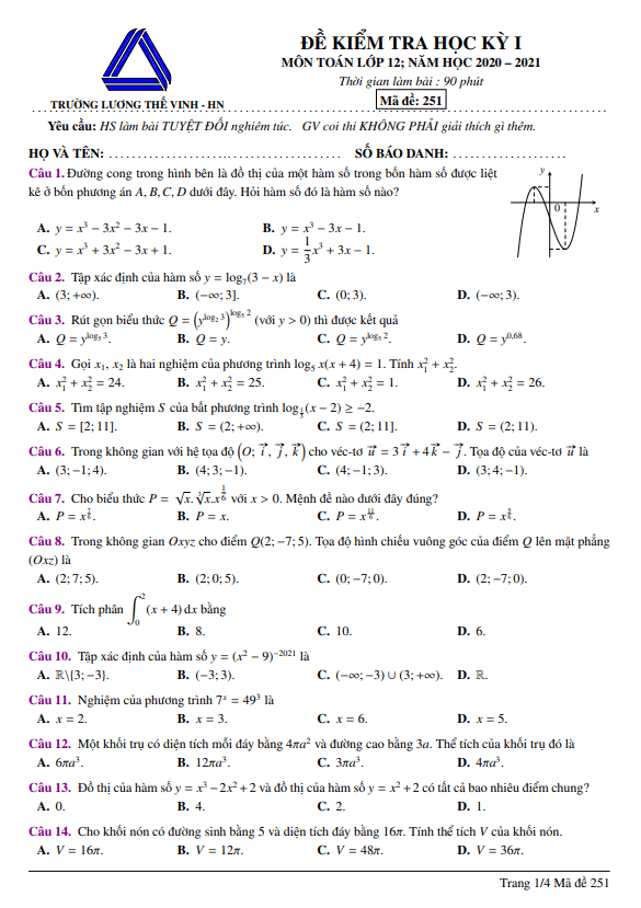 Vào sáng thứ Sáu ngày 25 tháng 12 năm 2020, trường THCS & THPT Lương Thế Vinh ở thành phố Hà Nội đã tổ chức kỳ thi kiểm tra chất lượng môn Toán cho học sinh khối 12 giai đoạn cuối trong học kỳ 1 năm học 2020 – 2021. Đề thi gồm 50 câu hỏi và bài toán dạng trắc nghiệm, bao gồm đáp án và lời giải chi tiết cho các mã đề 251, 252, 253, 254.