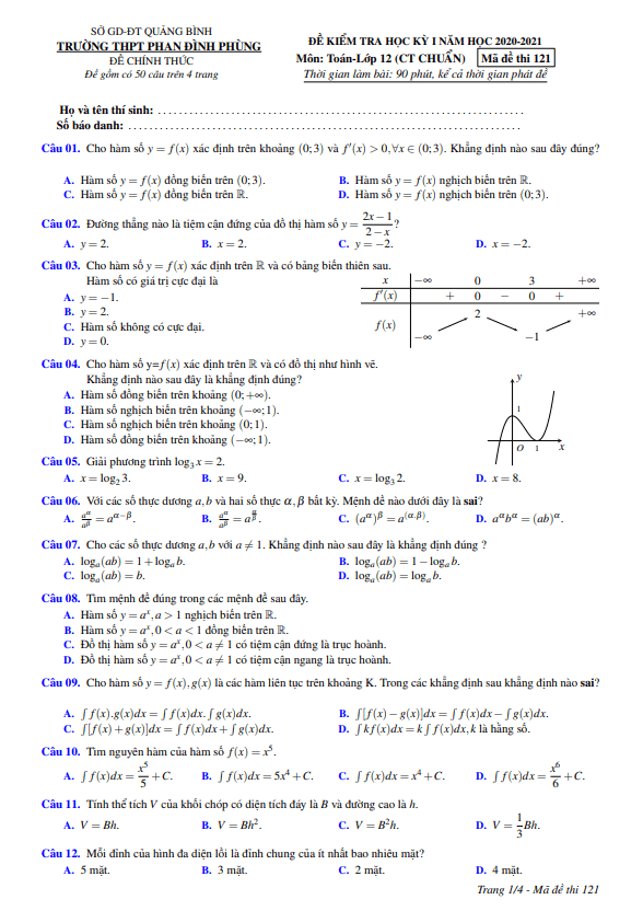 Ngày … tháng 01 năm 2021, trường THPT Phan Đình Phùng, thành phố Đồng Hới, tỉnh Quảng Bình đã tổ chức kỳ thi kiểm tra chất lượng học tập môn Toán cho học sinh lớp 12 trong giai đoạn cuối học kỳ 1 năm học 2020-2021. Đề thi này được biên soạn theo hình thức đề 100% trắc nghiệm, với thời gian làm bài là 90 phút. Để thuận tiện cho việc chấm điểm, đề thi có đáp án mã đề 121.