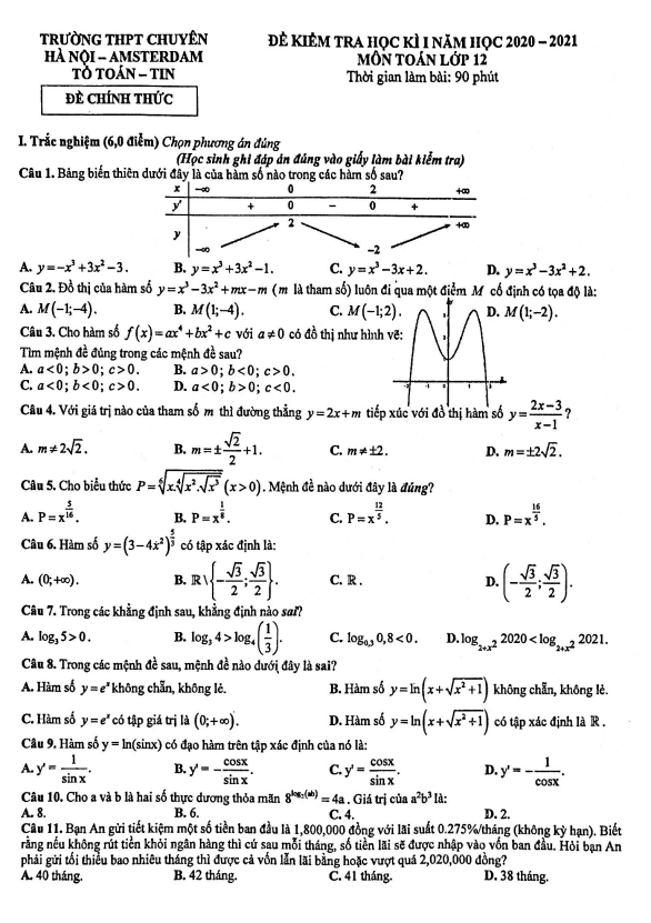 Đề thi học kì 1 Toán lớp 12 năm 2020 – 2021 trường THPT chuyên Hà Nội Amsterdam