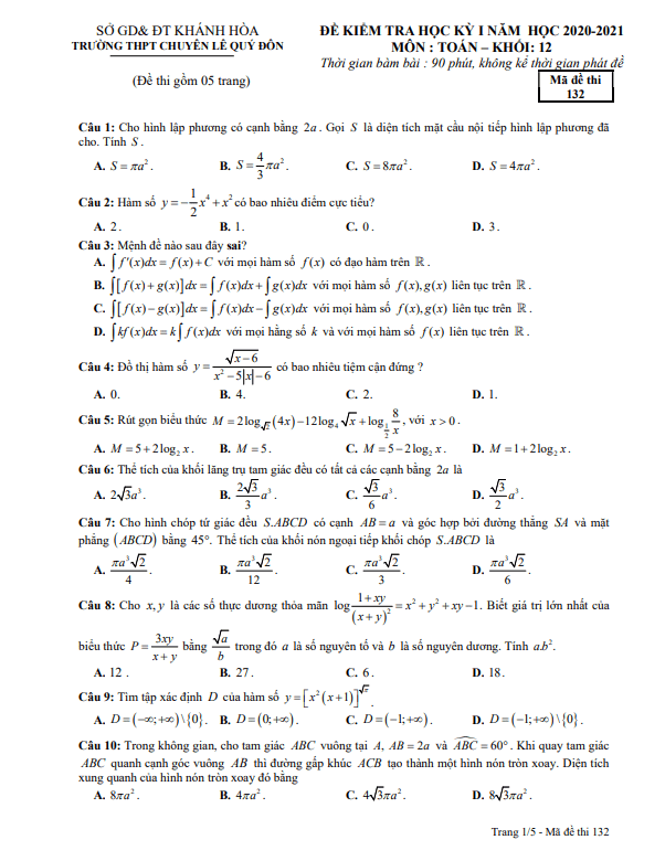 Đề thi HK1 Toán lớp 12 năm 2020 – 2021 trường THPT chuyên Lê Quý Đôn – Khánh Hòa