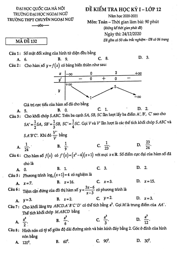 Đề thi học kỳ 1 (HK1) lớp 12 môn Toán năm 2020 2021 trường THPT chuyên Ngoại Ngữ Hà Nội