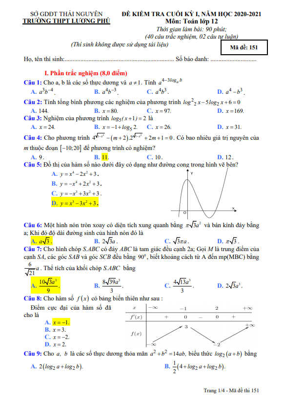 Đề thi HK1 Toán lớp 12 năm 2020 – 2021 trường THPT Lương Phú – Thái Nguyên