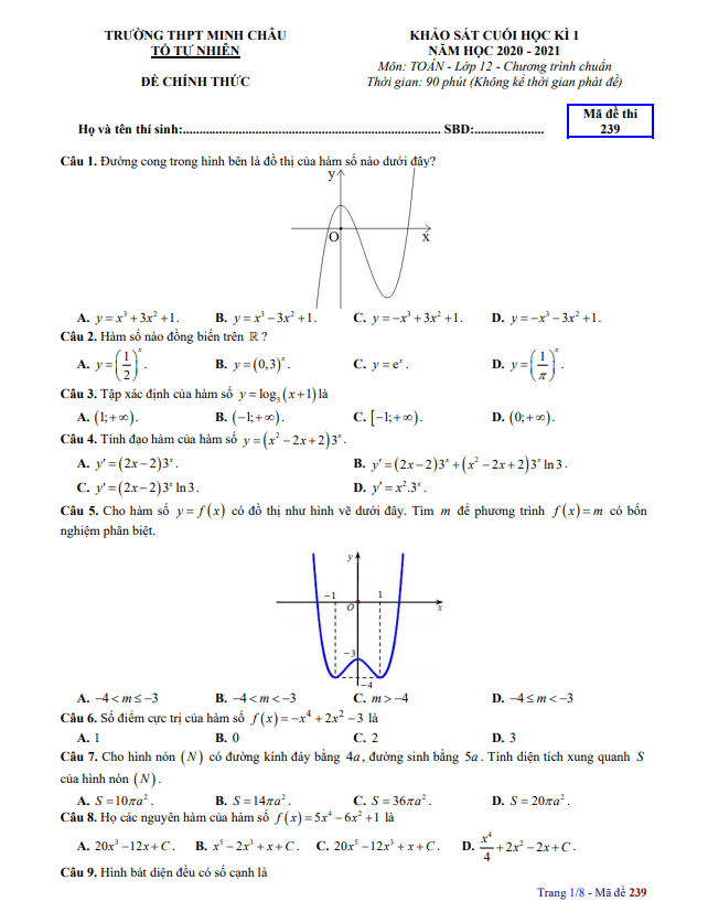 Đề thi học kì 1 (HK1) Toán lớp 12 năm 2020 – 2021 trường THPT Minh Châu Hưng Yên