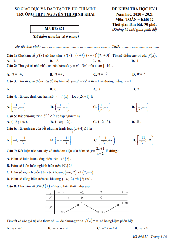 Đề thi học kì 1 Toán lớp 12 năm 2020 – 2021 THPT Nguyễn Thị Minh Khai TP HCM