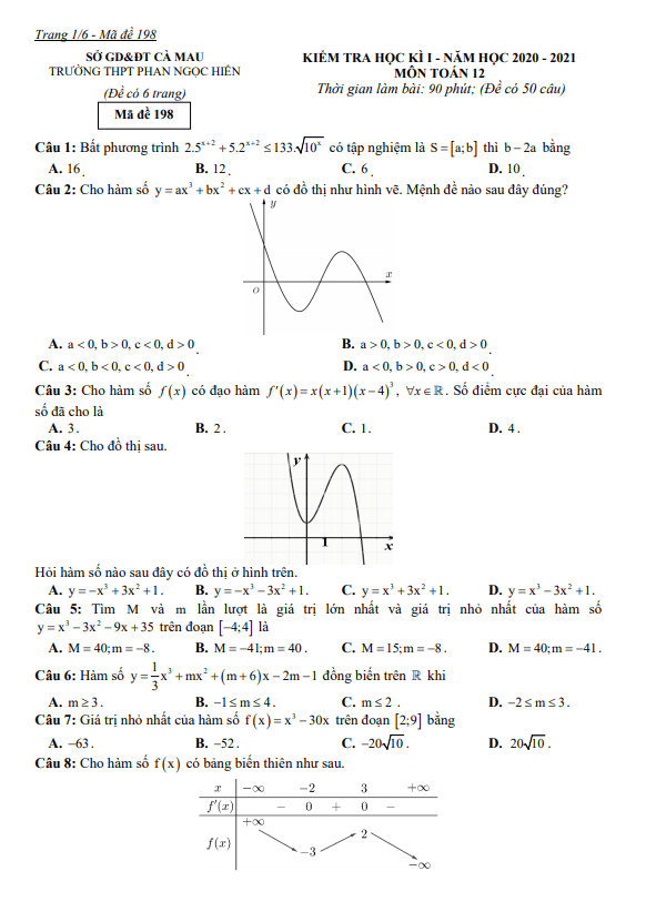 “Nội dung bài thi học kỳ 1 môn Toán lớp 12 năm 2020-2021 tại trường THPT Phan Ngọc Hiển Cà Mau được biên soạn đầy đủ và cụ thể. Đề thi bao gồm 50 câu hỏi và bài toán được biên soạn dưới dạng trắc nghiệm hoàn toàn, mang đến cho học sinh cơ hội để thể hiện kiến thức và kỹ năng của mình. Thời gian làm bài được giao là 90 phút, đủ để học sinh làm và kiểm tra sự hiểu biết của mình trong môn Toán.Kỳ thi được tổ chức vào ngày thứ Sáu, ngày 25 tháng 12 năm 2020, đây là cơ hội để học sinh thử sức và đánh giá mình trước kỳ nghỉ lễ cuối năm. Đề thi có một số câu hỏi đặc biệt như việc phân tích đồ thị hàm số, tính khoảng cách từ một điểm đến một mặt phẳng, và tính thể tích khối nón.Những câu hỏi này đòi hỏi học sinh phải áp dụng kiến thức toán học một cách linh hoạt và chính xác. Đề thi cũng đi kèm với đáp án để học sinh có thể tự kiểm tra và đánh giá kết quả của mình. Điều này giúp học sinh hiểu rõ hơn về những kiến thức đã học và cần cải thiện điểm yếu.Đề thi không chỉ đánh giá kiến thức mà còn khuyến khích học sinh phát huy tư duy sáng tạo và kỹ năng giải quyết vấn đề. Điều này giúp học sinh phát triển toàn diện và chuẩn bị tốt cho kỳ thi học kỳ sau. Chúc các em học sinh sẽ làm bài tốt và đạt kết quả cao trong kỳ thi này.”