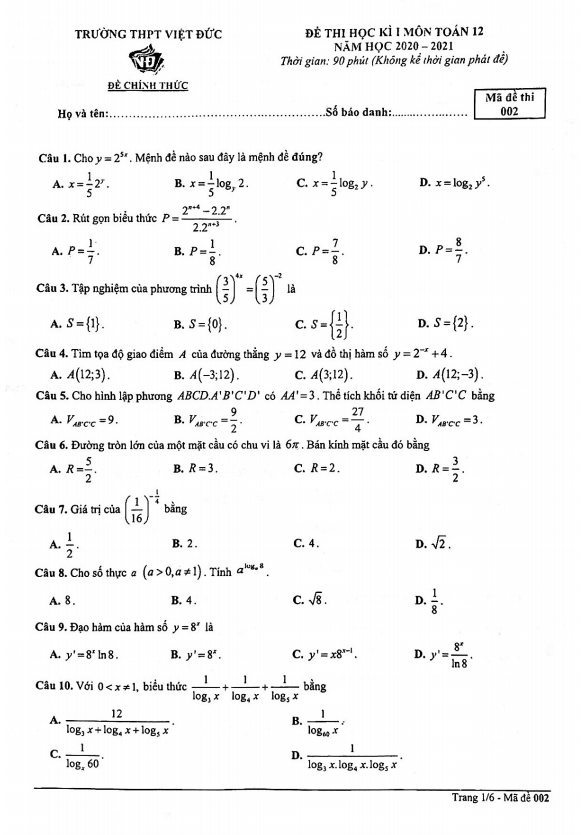 Đề thi Học kì 1 môn Toán lớp 12 năm học 2020 – 2021 của trường THPT Việt Đức Hà Nội có mã đề 002, bao gồm 50 câu hỏi và bài toán dạng trắc nghiệm trải qua 06 trang. Thời gian làm bài thi là 90 phút.