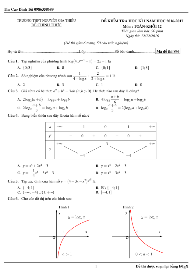 Đề thi học kì 1 môn Toán lớp 12 năm học 2016 – 2017 của trường Nguyễn Gia Thiều ở Hà Nội là bài kiểm tra gồm 6 trang với tổng cộng 50 câu hỏi dạng trắc nghiệm. Đề thi này đánh giá ở mức độ khó và nằm trong chương trình học của trường.