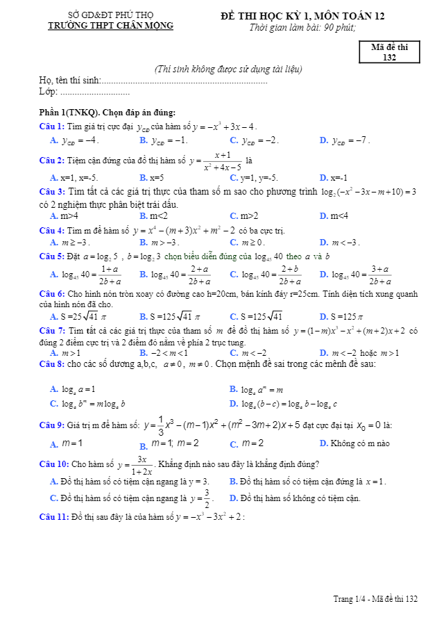 Đề thi học kì 1 (HK1) lớp 12 môn Toán năm học 2016 – 2017 trường THPT Chân Mộng Phú Thọ