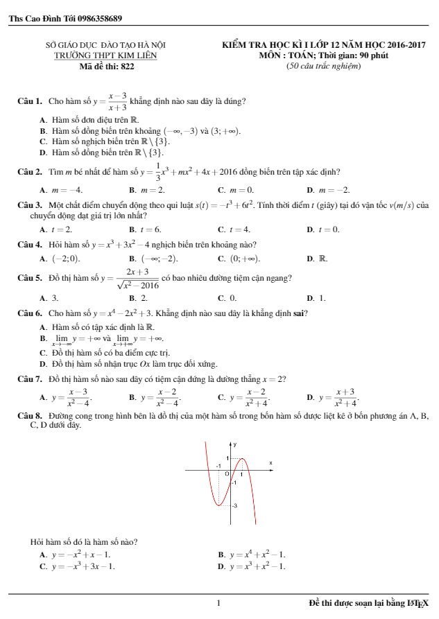 Đề thi HK1 Toán lớp 12 năm học 2016 – 2017 trường THPT Kim Liên – Hà Nội
