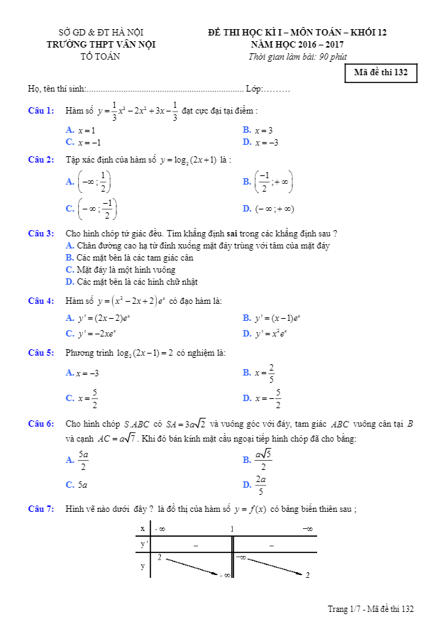 Đề thi học kì 1 môn Toán lớp 12 năm học 2016 – 2017 của trường THPT Vân Nội Hà Nội bao gồm 17 trang với tổng cộng 50 câu hỏi trắc nghiệm khách quan, cung cấp đáp án chi tiết giúp học sinh tự kiểm tra và đánh giá kỹ năng Toán của mình.