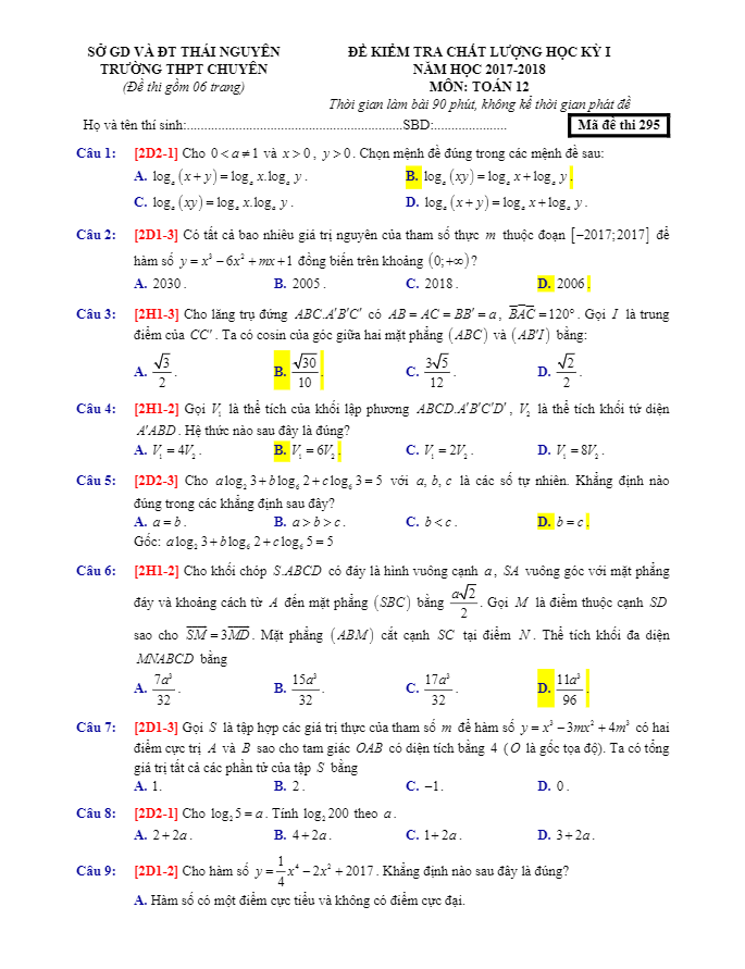 Đề thi học kì 1 môn Toán lớp 12 năm học 2017 – 2018 của trường THPT chuyên Thái Nguyên bao gồm tổng cộng 50 câu hỏi trắc nghiệm. Thời gian làm bài được quy định là 90 phút, đề bài đi kèm với đáp án và lời giải chi tiết. Đây là một đề thi chất lượng và uy tín từ một trường chuyên, giúp học sinh chuẩn bị tốt cho kỳ thi học kì 1 lớp 12 cũng như kỳ thi THPT Quốc gia sắp tới.