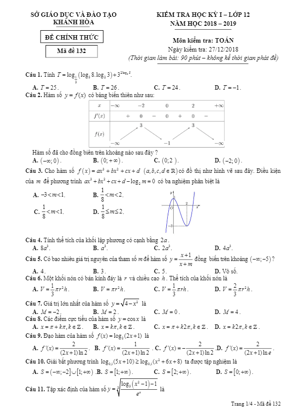 Đề thi học kỳ 1 môn Toán lớp 12 năm học 2018 – 2019 của sở GD&ĐT Khánh Hòa đã được Sytu chia sẻ đến thầy cô và các em học sinh lớp 12. Đề thi có mã đề 132, bao gồm 50 câu hỏi và bài toán trắc nghiệm khách quan, được ra vào ngày 27 tháng 12 năm 2018. Thời gian làm bài thi là 90 phút. Kỳ thi này cung cấp đáp án cho các mã đề 132, 209, 357, 485.Một trong các câu hỏi trích dẫn từ đề thi bao gồm vấn đề về khối đa diện đều, nơi một khối đa diện đều loại {p;q} được định nghĩa là khối đa diện lồi, mỗi mặt là một đa giác đều p cạnh và mỗi đỉnh là đỉnh chung của đúng q mặt. Thí sinh cần phải xác định mệnh đề đúng trong số các mệnh đề được đưa ra.Thêm vào đó, đề thi còn đưa ra các bài toán khác như bài toán xoay hình vuông để tạo hình trụ tròn xoay, và bài toán đạo hình côn từ tam giác. Đề thi này đòi hỏi kiến thức và kỹ năng tính toán của học sinh lớp 12.Qua việc chia sẻ nội dung đề thi này, Sytu hy vọng rằng thầy cô và các em học sinh sẽ có thêm tư liệu để ôn tập và chuẩn bị cho kì thi học kỳ 1 môn Toán một cách tốt nhất. Đề thi Toán môn 12 năm học 2018 – 2019 sở GD&ĐT Khánh Hòa là cơ hội để học sinh kiểm tra kiến thức và chuẩn bị tốt nhất cho kì thi sắp tới.