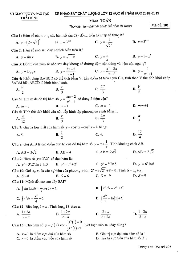 Đề thi Toán lớp 12 năm học 2018 – 2019 sở GD&ĐT Thái Bình bao gồm 4 trang với 50 câu hỏi và bài tập theo hình thức trắc nghiệm khách quan. Thời gian làm bài là 90 phút (không tính thời gian giám thị coi thi phát đề). Đề thi có đáp án các mã đề 101, 102, 103, 104, 105, 106, 107, 108.
