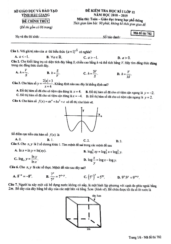 Đề thi học kỳ 1 môn Toán lớp 12 năm học 2018 – 2019 sở GD và ĐT Hậu Giang có mã đề 702 được biên soạn nhằm đánh giá chất lượng học tập của học sinh. Đề thi bao gồm 50 câu hỏi và bài toán trắc nghiệm khách quan, học sinh sẽ có 90 phút để hoàn thành. Kỳ thi diễn ra vào ngày 24 tháng 12 năm 2018.