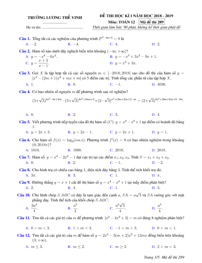 Xin chào các bạn đọc, hôm nay Sytu xin giới thiệu đến các bạn đề thi học kỳ 1 môn Toán lớp 12 năm học 2018 – 2019 của trường Lương Thế Vinh Hà Nội. Đề thi được tổ chức vào ngày 07 tháng 12 năm 2018, với mã đề 289, gồm 50 câu hỏi và bài tập trắc nghiệm khách quan trải đều trên 5 trang. Thời gian làm bài là 90 phút.