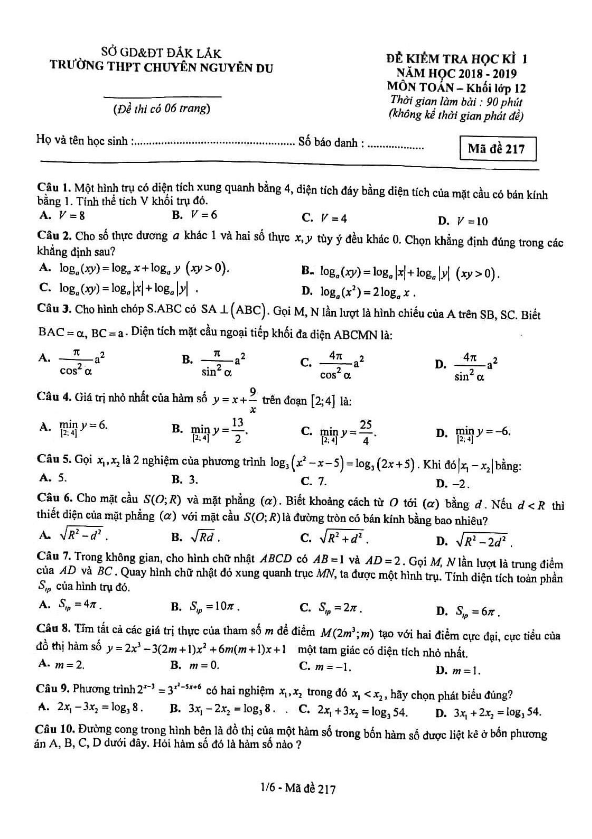 Đề thi học kì 1 môn Toán lớp 12 năm học 2018 – 2019 trường THPT chuyên Nguyễn Du – Đăk Lăk có mã đề 217 được tổ chức nhằm tổng kết kiến thức Toán lớp 12 mà học sinh đã học trong giai đoạn học kỳ 1 vừa qua của năm học 2018 – 2019. Đề thi này sẽ giúp học sinh chuẩn bị tốt cho kỳ thi học kì 1 môn Toán lớp 12 sắp tới.